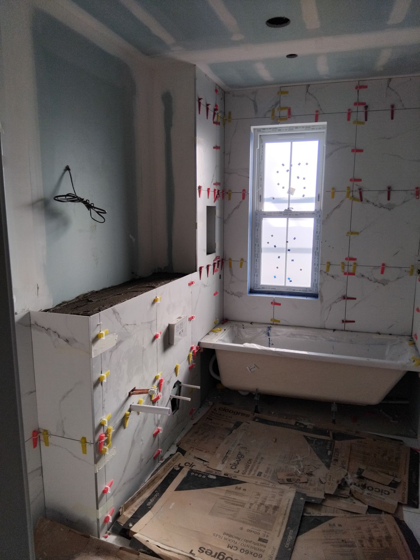 - Remaining Bathroom Walls: Half-height tiling installed around all perimeter walls